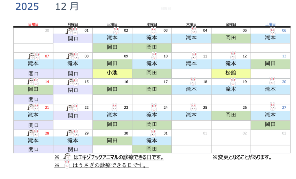 ※犬・猫以外のペットについては、診療日が決まっておりますので、完全予約制となります。