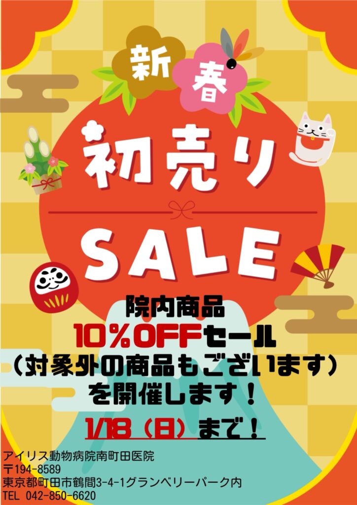 初売りSALE! 〜1月18日まで 2026年1月8日 by iris_minamimachida 1月18日(日)まで!院内商品10%OFFキャンペーンを開催いたします!対象商品→フード、ケア用品、サプリメントなど ※対象商品について詳しくはスタッフまでお尋ねください※他割引など併用はできかねます