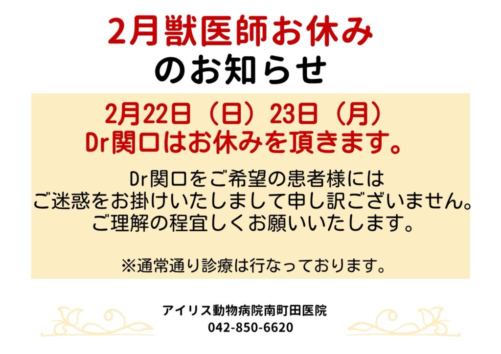 2月獣医師のお休みをお知らせいたします。