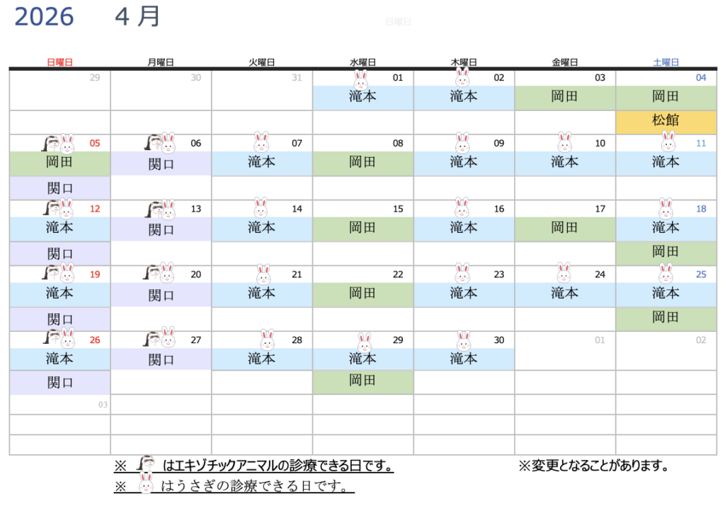 ※犬・猫以外のペットについては、診療日が決まっておりますので、完全予約制となります。