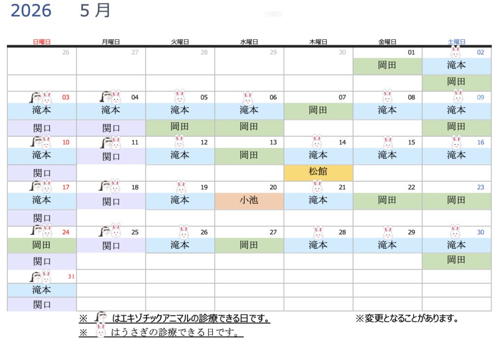 ※犬・猫以外のペットについては、診療日が決まっておりますので、完全予約制となります。